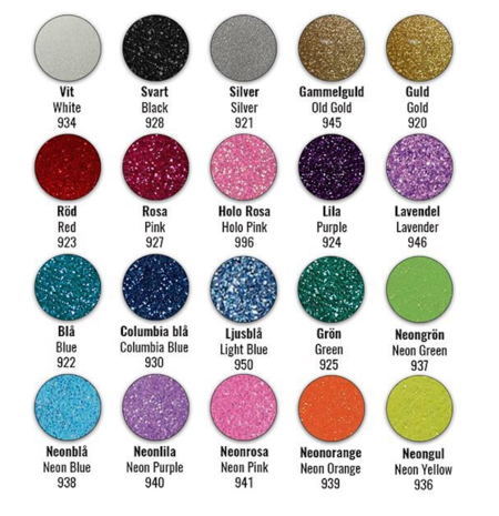 Vi har over 50 forskellige broderifarver at vælge imellem og et stort udvalg i tryk - lige fra alm. farvetryk til tryk med metallic og glitter effekt