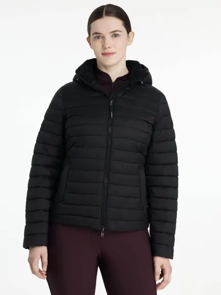 Jakken har vandafvisende ydre, aftagelig hætte, elastiske manchetter og praktiske lynlåslommer, perfekt til ridning og aktive udendørsdage.